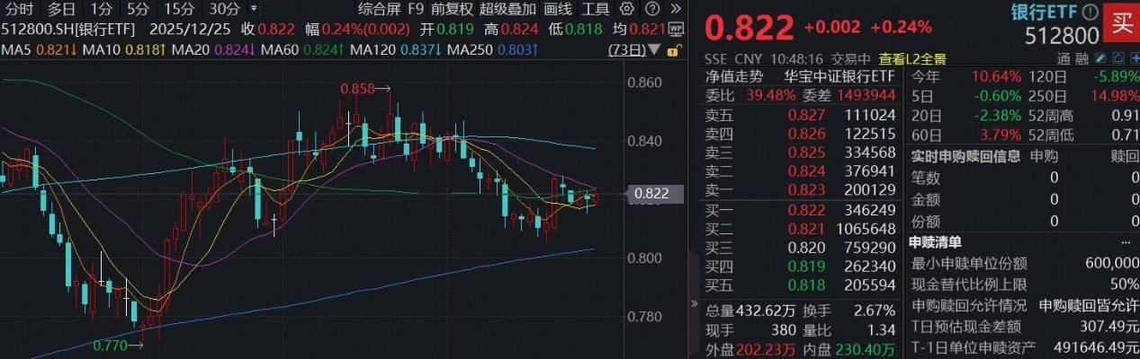 12月25日,银行板块小幅回暖,个股多数飘红,截至发稿配资炒股网站,瑞丰银行涨超2%,光大银行、中信银行、上海银行等涨幅居前。全市场规模最大的银行ETF(512800)场内价格现涨0.24%,站上5日线。
